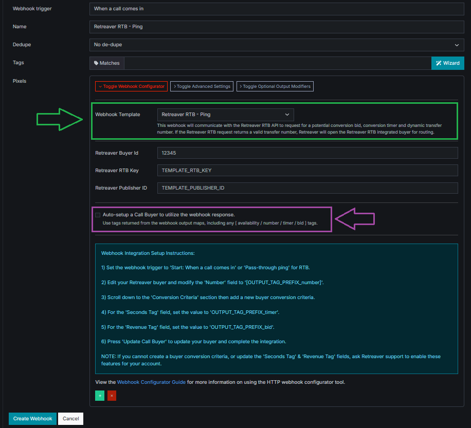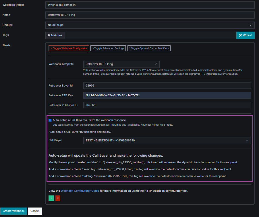 Once the webhook is created, Retreaver will automatically generate a webhook integration with your chosen API platform as well as tag the selected buyer profile with any relevant tag routing conditions and conversion criteria.