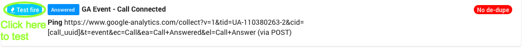 Either place a call through the campaign that will trigger each event, or use the “Test Fire” button in Retreaver to send a call to Google Analytics. This will help you check that the events are being registered correctly.