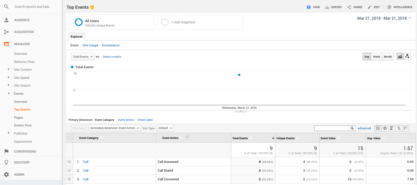 Ultimately, use any event category, action and label you like. For simplicity, we’ve kept the category as “Call” and the action and label the same as each other.
