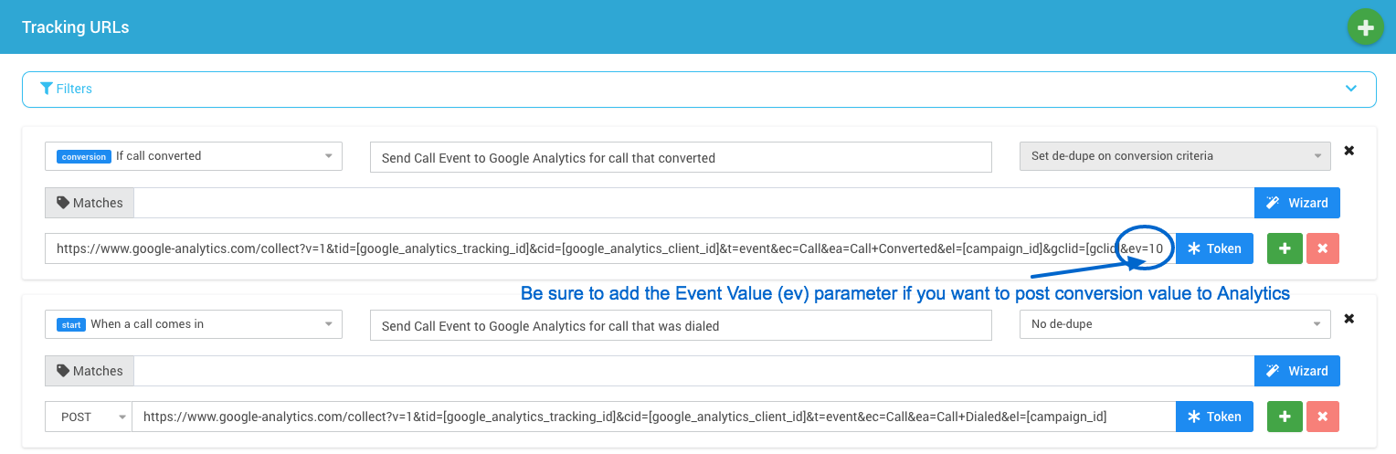 - ev = Optional. Event Value. Must be an integer (Google limitation). This will track the value of the conversion from the call into Google Analytics. We recommend using a [revenue] replacement token.