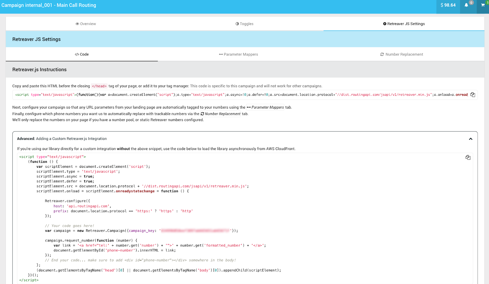Step 4) Update & add Retreaver.js using the “Advanced” version of the Retreaver.js for your Landing Page or Website.