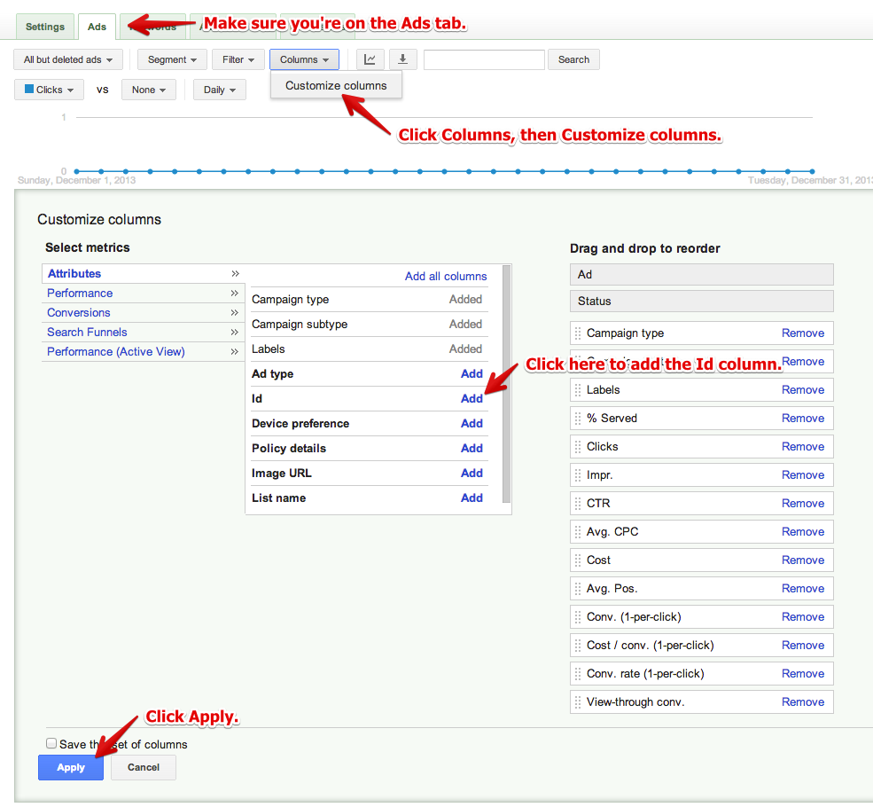 In order to get the creative ID that will be passed to our landing page, we need to enable the Id column in Google Ads.