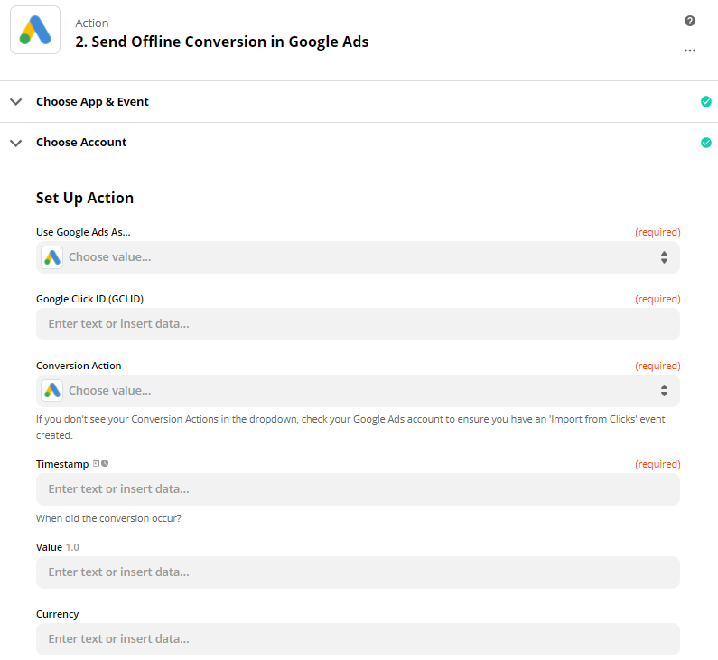 - Triggering a Zapier "Send Offline Conversion in Google Ads" step
