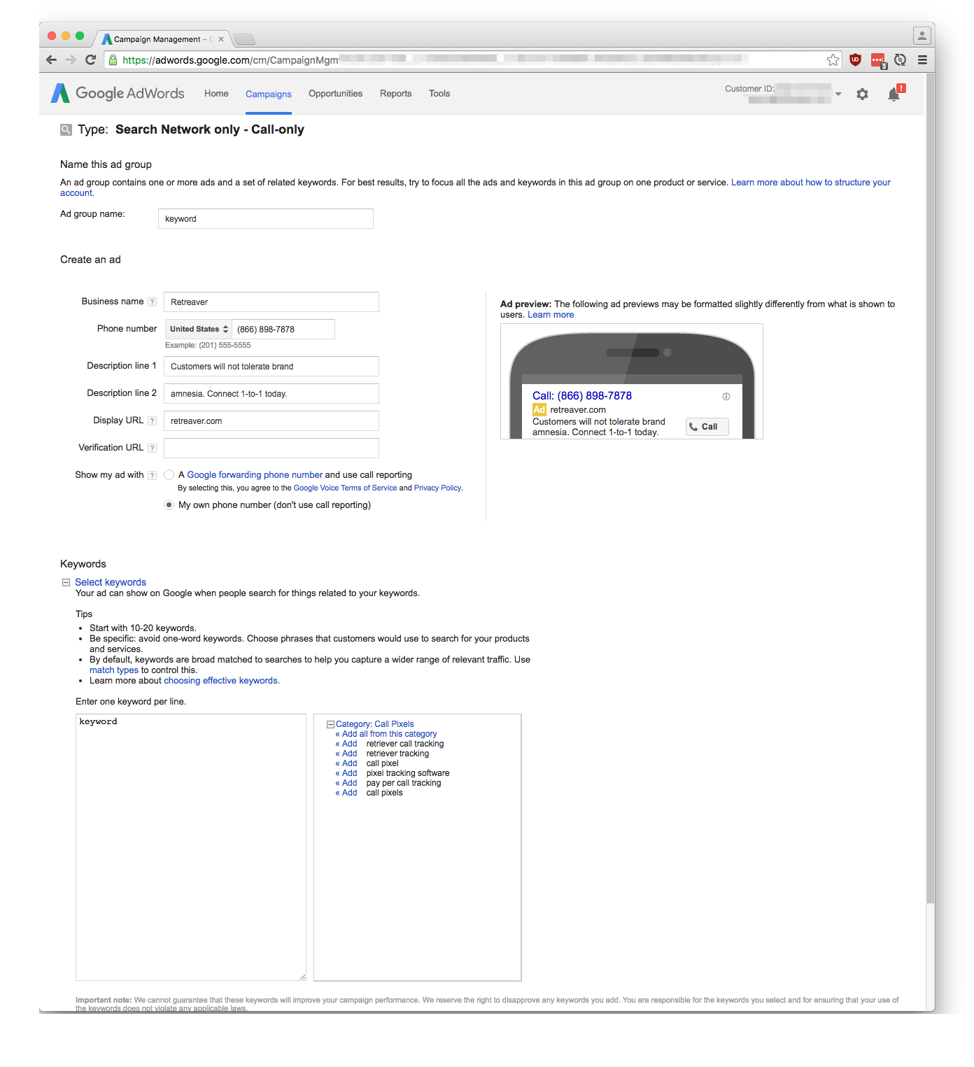 In order to pass keywords into Retreaver from Google Ads Call-Only ads, you must set up a static phone number in Retreaver which is tagged with each keyword you wish to apply, and then in Google Ads set up a corresponding Ad Group using your recently created and tagged phone number. Any resulting calls will then inherit all present tags on a static phone number, including any keywords or attributes you have previously assigned to that particular tracking number.