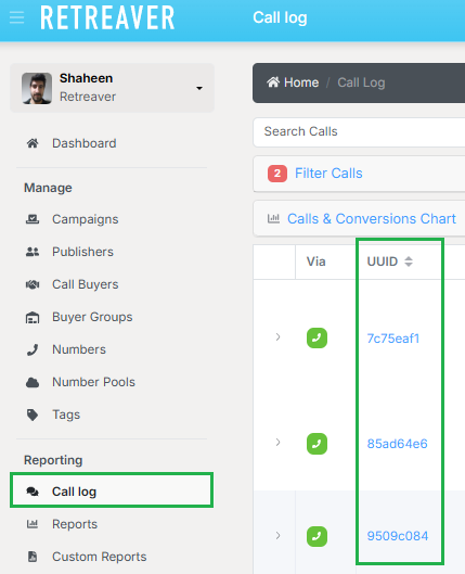 Navigate to the 'Call Log' page, then select a call UUID from the call log page.
