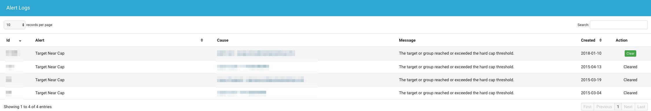 Alert logs are intended to provide you with a more detailed explanation of the alert and the ability to find out the exact cause. You can click on the specific cause or use the clear button under action to remove that alert completely. You are also provided the date in which this event took place and the type of alert that it is.