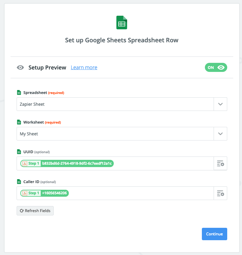 - Here i created 2 columns - "UUID" and "Caller_ID" inside of "My Sheet" , you may need to refresh fields if you just made changes to your sheet. Map your incoming tags to the columns in your sheet.