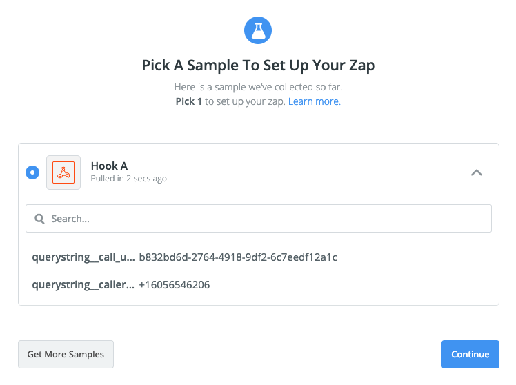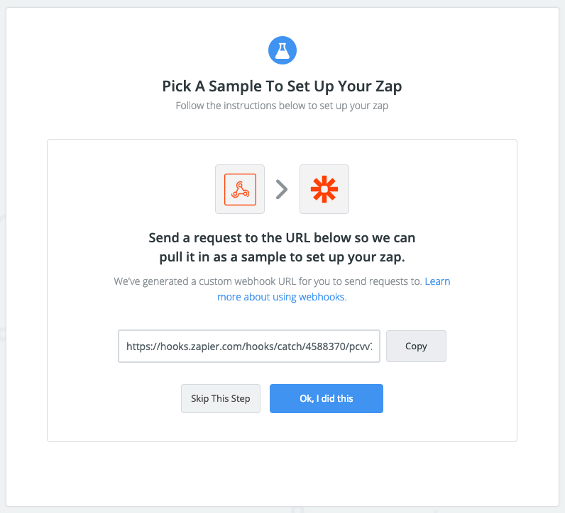 - Zapier supports splitting a webhook payload to only include your desired attributes, but in this case we want to capture everything so skip the "Pick off a child key" page