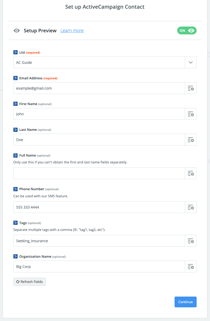 Note: For the image below I have hardcoded the requested fields but in practice you will be mapping the tags you sent to Zapier using the buttons on the right.