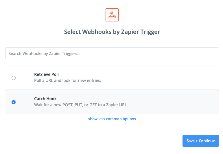- Zapier is very customizable and can listen for a multitude of signals, in this example we will choose webhook. Chose the "Catch Hook" option to create a url that will listen for the Retreaver webhook