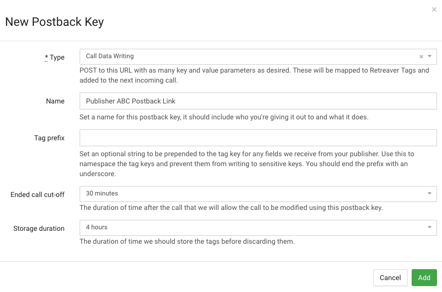 - The postback key section is visible at the bottom of a publisher view page. Press the green addition button to create a new postback key, select the type: "Call Data Writing", then insert a descriptive name and configure the end call cut-off time or storage duration if applicable. Lastly press "Add" to create the postback key.