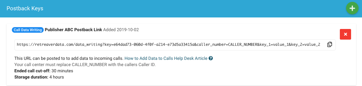 The PUBLISHER_KEY value will be automatically generated by Retreaver when creating the postback. The CALLER_NUMBER value is supplied by the publisher to instruct Retreaver to apply the payload to that caller once they interact with a Retreaver campaign.