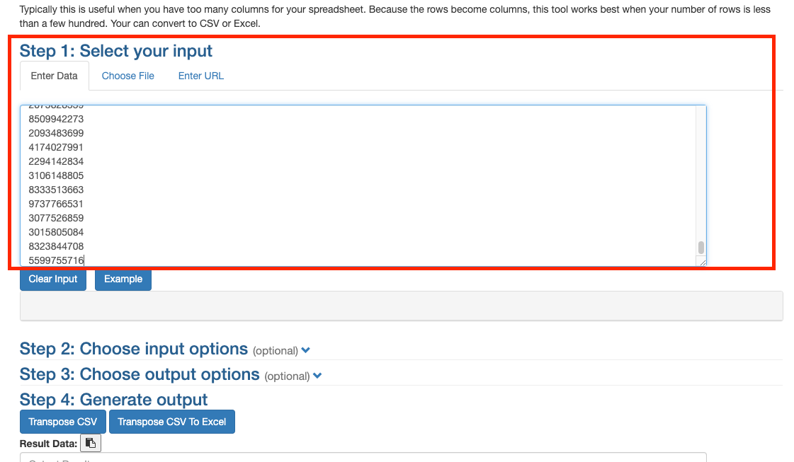Head to "ConvertCSV.com" [ https://www.convertcsv.com/transpose-csv.htm ] to transpose your list, this free online tool will help you process the list into a format that Retreaver tags can accept. Paste your numbers into the Step 1 input box: