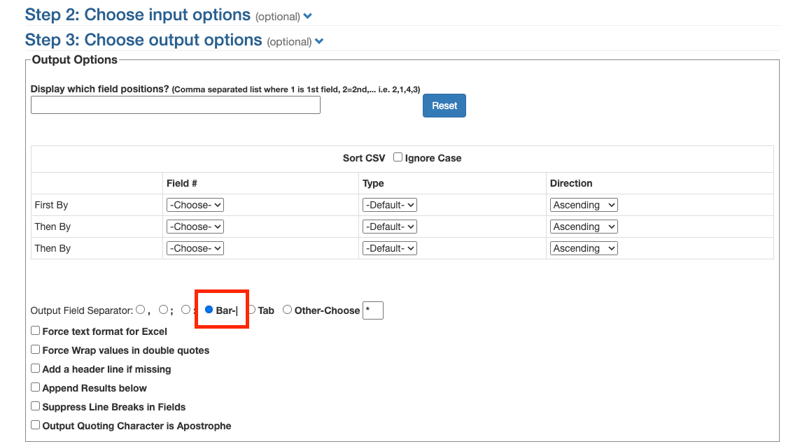 While in the webpage, scroll to the section titled “Step 3”. You might have to click on the down arrow to open up additional step 3 options and click on the “Bar | “ option. This will combine all your numbers listed in step 1, using a bar character to connect them.
