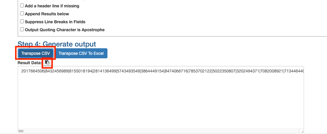 Within the Step 4 section, click on the “Transpose CSV” option. Once completed, click on the clipboard option to copy the resulting transposed CSV text.
